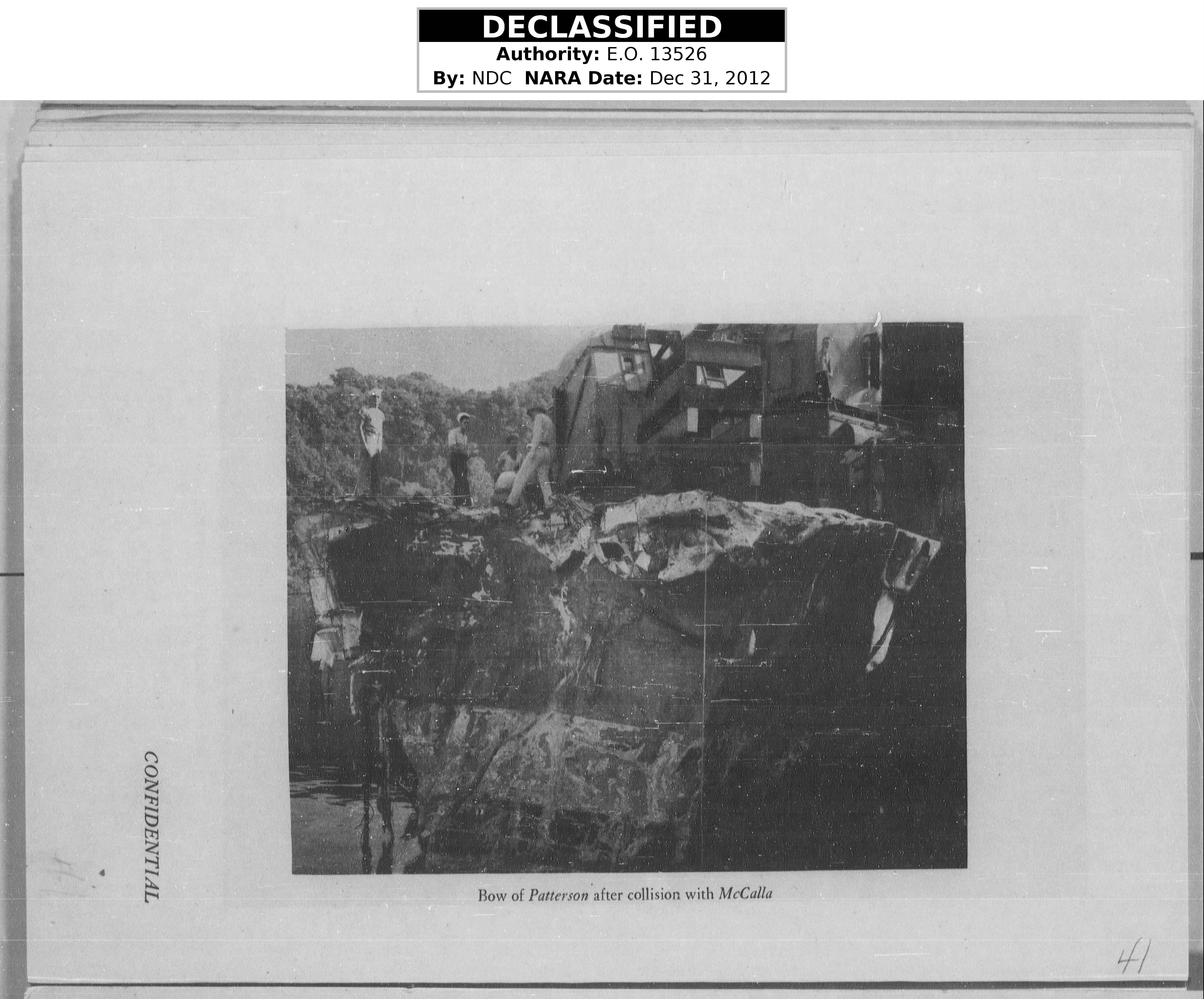ore midnight, the McCalla, was engaged with Japanese barges north of Kolombangara Island (Solomon Islands). After several engagements with the barges, McCalla dodged a number of projectiles that landed close to the ship. Due to the engagements, McCalla was some distance from the main task group and was ordered to join up with the rest of the ships. At some point on her return to the task group, she experienced a steering casualty and when some of the smoke of the battle cleared it was evident that she was on a collision course with Knoertzer’s old ship, the Patterson. The Patterson attempted to avoid the collision but was struck by McCalla‘s bow just forward of the #1 gun turret. The bows of both ships were sheared off. The Patterson suffered 3 men killed and more than a dozen wounded in the collision (see photo of Patterson damage). The McCalla fared much better with only one injury. Clearly, this was not the way that Knoertzer wanted to have a reunion with his old ship. Both ships were outfitted with temporary bows and headed to dry dock for more intensive repair.