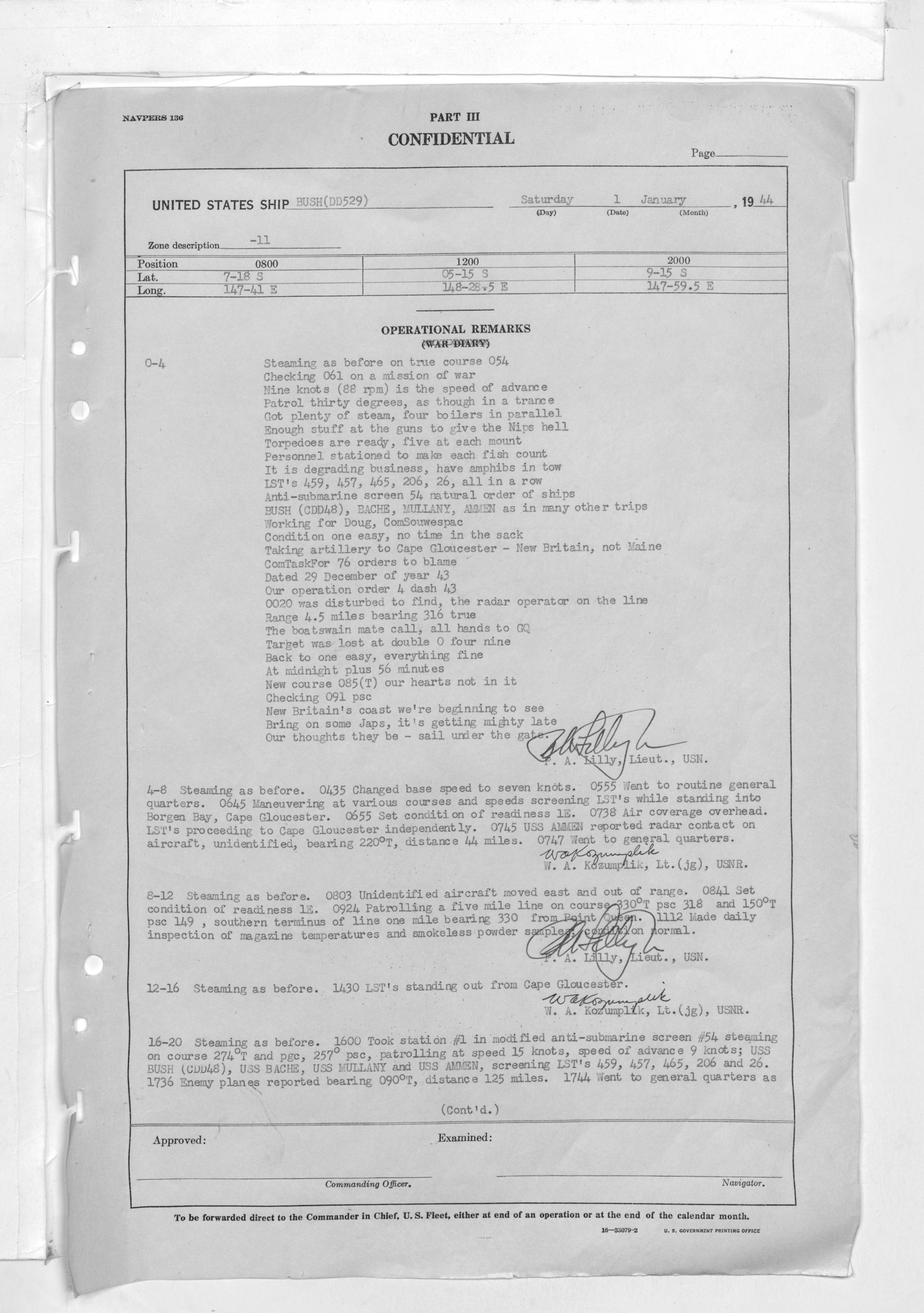 Here is the content of the USS Bush’s deck log for January 1, 1944, from 0000 hour to 0400. The actual deck log can be seen here.
