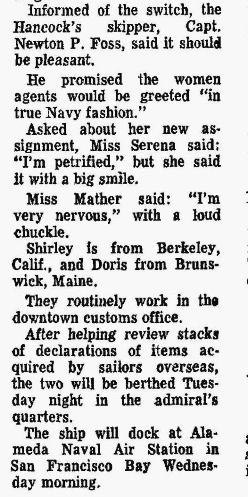 Captain Foss experienced a “first” in 1970 as he brought the Hancock back to Alemeda, CA, after a deployment in the Pacific. According to an article in the Edwardsville Intelligencer (Illinois), U.S. Customs allowed two women Inspectors (along with 3 men) to be helicoptered out to the Hancock to begin the property declaration process, so that the sailors could leave the ship as soon as it docked (see the clipping here and here). In the past, only men had been given that duty. Captain Foss said that their visit should be pleasant and that they would be greeted in “true Navy fashion.” The crew had a lot to declare, as seen in this clipping from the The Argus (Freemont, CA) in the April 17, 1970, edition. Honda motorcycles were very popular in 1970!